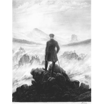 On purpose the person is placed in front of the vanishing point, so that a viewer would involuntarily place himself in the position of the figure and even look at the nature, as if he were standing on this cliff.