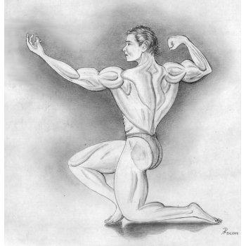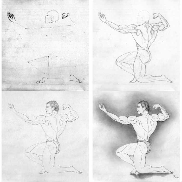normal sketchbook paper (DIN-A3)Pencil HB for pre drawing, fine lines, area-darkening and graphite-powder Eraser (2 x 2 x 0.6 cm) for area-lightening Eraser (small - at the end of a pencil) to smear graphite-powder Sandpaper to produce graphite-powder with the HB-pencil Paper handkerchief to smear graphite-powder or for blurring (wide areas) Finger to smear graphite-powder or for blurring (middle areas) Pen with