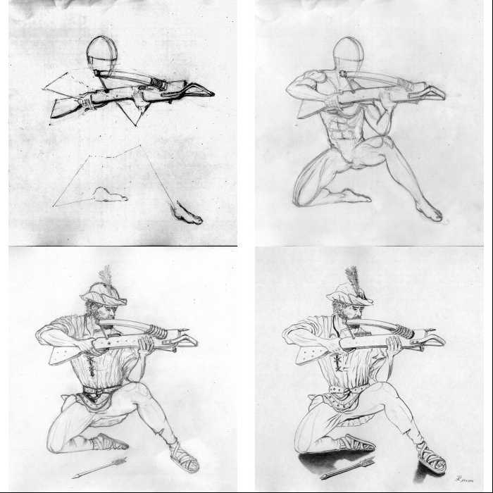 The drawing shows the moment before Tell raises the crossbow and aims. He is fighting against the pressure of the situation.