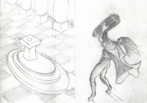 I've drawn the figure completely free. The environment was sketched with vanishing point rules (I remembered some of the construction-rules from a long time ago – I used no ruler).